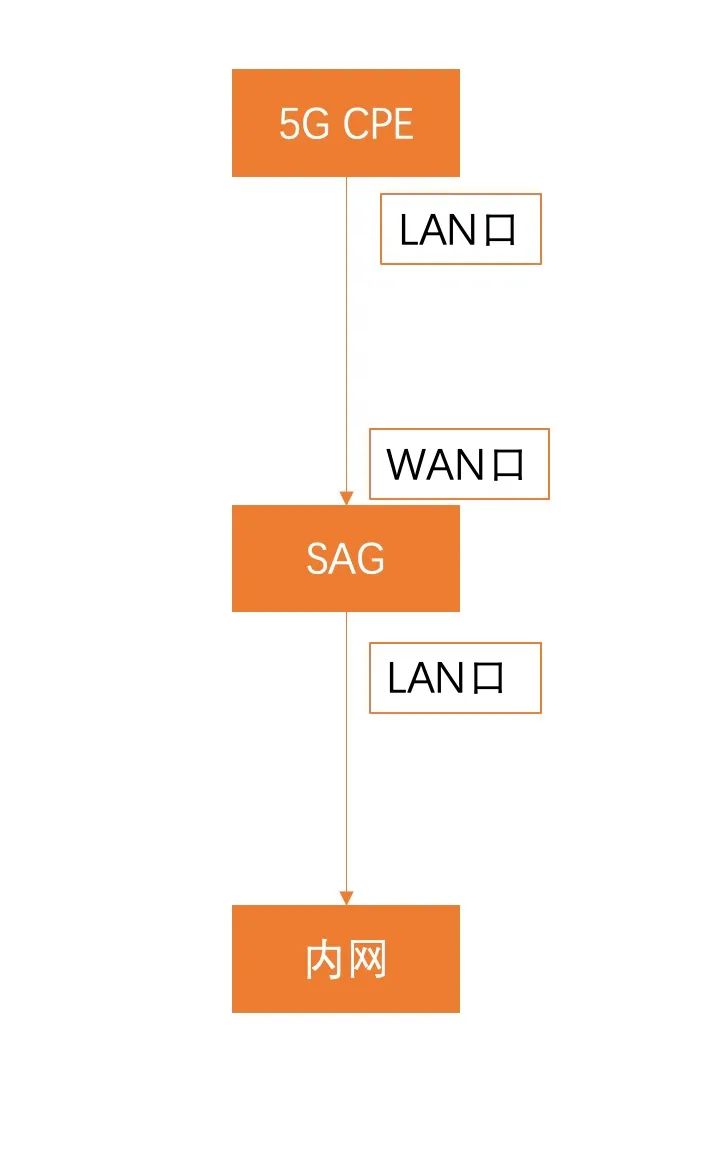 将5G CEP设备的LAN口接入POE供电模块,并将POE供电模块的另一端与SAG的WAN口相连,并根据CPE设备的LAN口地址来配置SAG的WAN IP地址。SAG的LAN口接内网交换机,与内部设备互联。