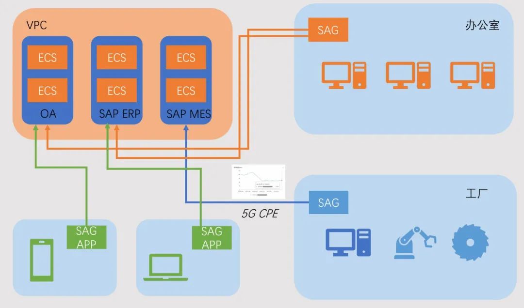 之所以要测试SAG+5G是因为有个制造业的客户要在云上部署SAP的ERP和MES系统,为了云上云下网络的高效稳定连接选择了SAG智能接入网关,但工厂所在的位置布线不便但却能够使用5G网络,因此才考虑使用5G作为SAG的上云链路。