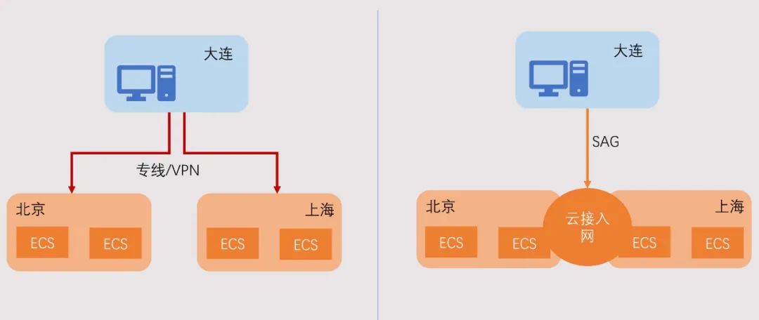 假设生产中心设置在北京,灾备中心设置在上海,大连的办公室和工厂只需要一条SAG线路即可同时接入生产和灾备中心,而采用专线和VPN则需要分别接入。