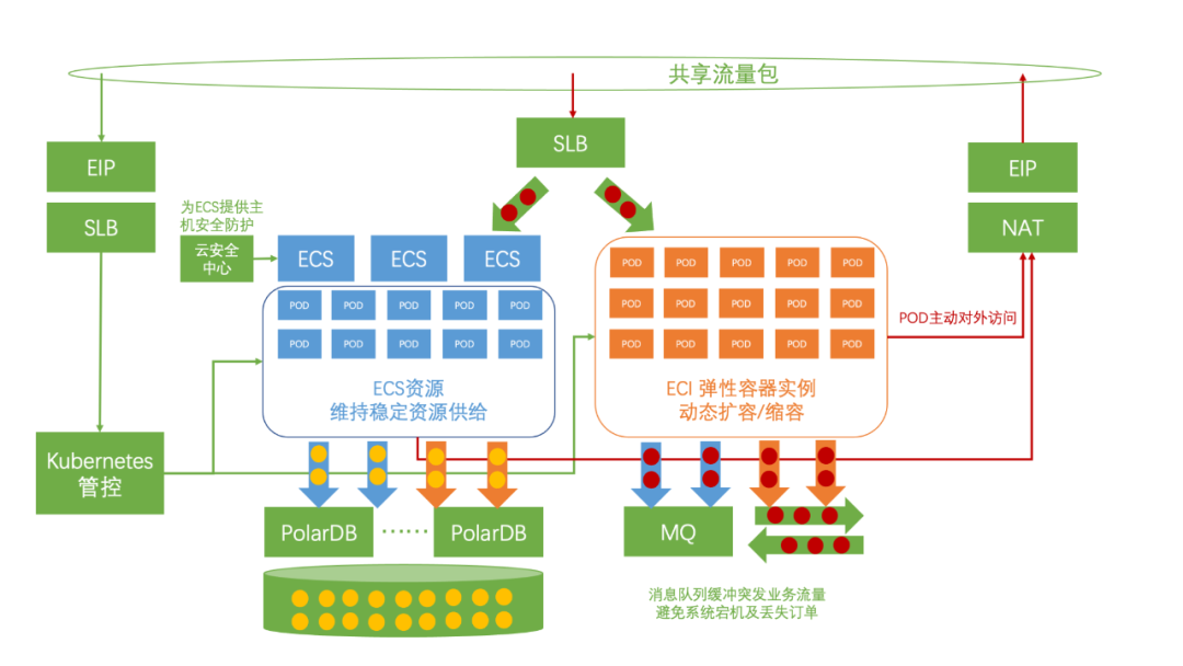 鉴于ECI节点上服务的启动需要一定的时间,而业务流量可能瞬间到达峰值,因此通过MQ来缓冲瞬时的业务压力,为运行在ECI弹性资源上的服务争取启动时间。