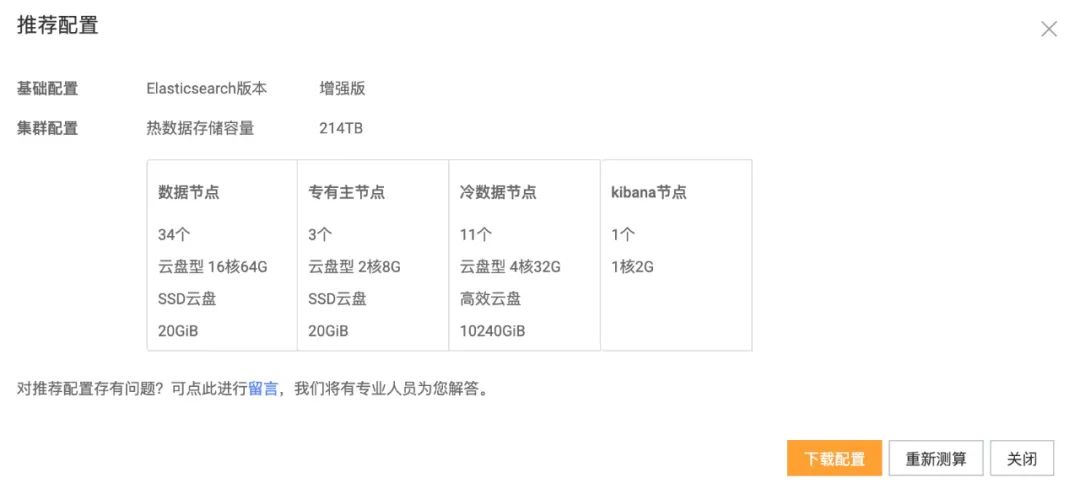 在进行Elastic购买时可以通过选型工具对集群的配置进行容量规划,假如写入的吞吐达到一定的量级,阿里云就会建议使用增强型的集群: