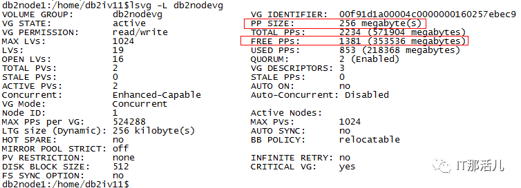 当前VG db2nodevg的pp size为256MB,pp size即扩容的最小单位大小。当前剩余可扩容数量为1381个,即:1381*256M=353536M(350G)