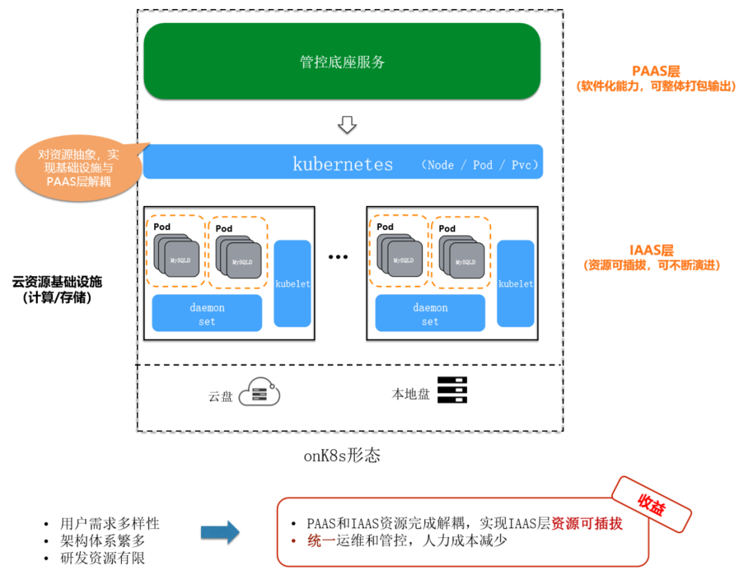 在我们演进到云原生架构之后,引入K8s作为统一的接入层。K8s能够把整个IaaS资源做抽象,抽象成Node/Pod/Pvc等不同的资源模型,并且它提供了标准化的接口,能让上层的PaaS平台统一化、标准化进行调用。