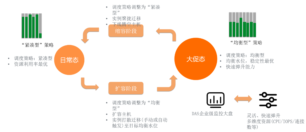 第三个是面向大促场景的调度,举个例子,我们在支持阿里核心电商的数据库集群双11前,需要将数据库集群通过弹性调度的方式让整个集群达到大促态,来备战双11,双11结束后,又会将整个集群的调度为“紧凑型”,回到日常态。