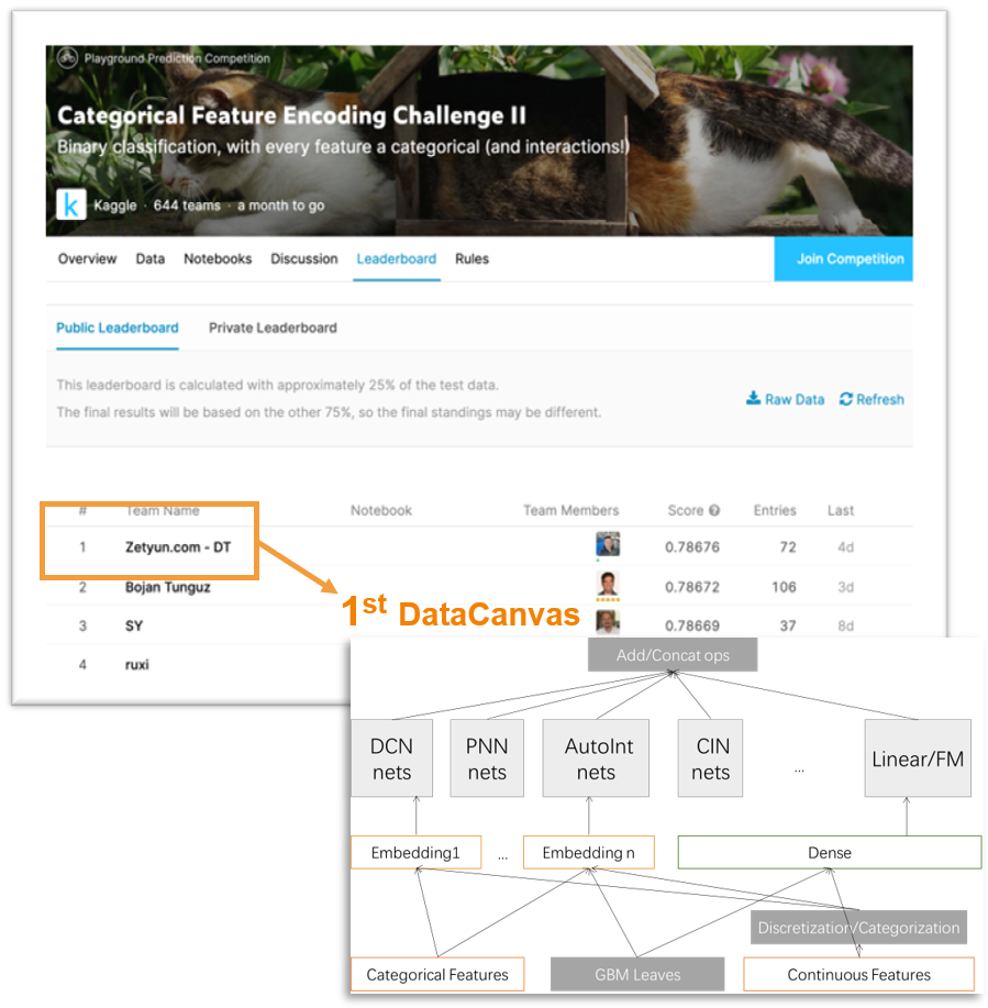 为了解决在建模过程中目前主要存在的痛点——专业领域的复合型人才稀缺,数据的属性不同,造成建模工作的不确定性。九章云极DataCanvas的研发团队将多年以来服务于各个行业客户所积累的经验,沉淀于DeepTables深度学习工具之中,以自动机器学习工具包的形式提供解决方案为企业寻求解决和突破。九章云极DataCanvas数据科学产品部资深架构师杨健表示,在DeepTables里面主要通过四种类型的网络构件——Embedding、特征交互层、特征提取层、GBM模型的融合,来提升神经网络在结构化数据上的学习能力。值得一提的是,凭借DeepTables这一开源项目,九章云极DataCanvas在齐聚1万3千多家参赛队伍的全球数据科学顶级Kaggle竞赛中,摘获第一名,为深度学习技术在结构化数据分析领域赋予了全新价值。目前,九章云极DataCanvas已积累200多件自主知识产权,其中包含50多件发明专利。