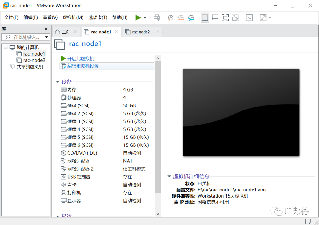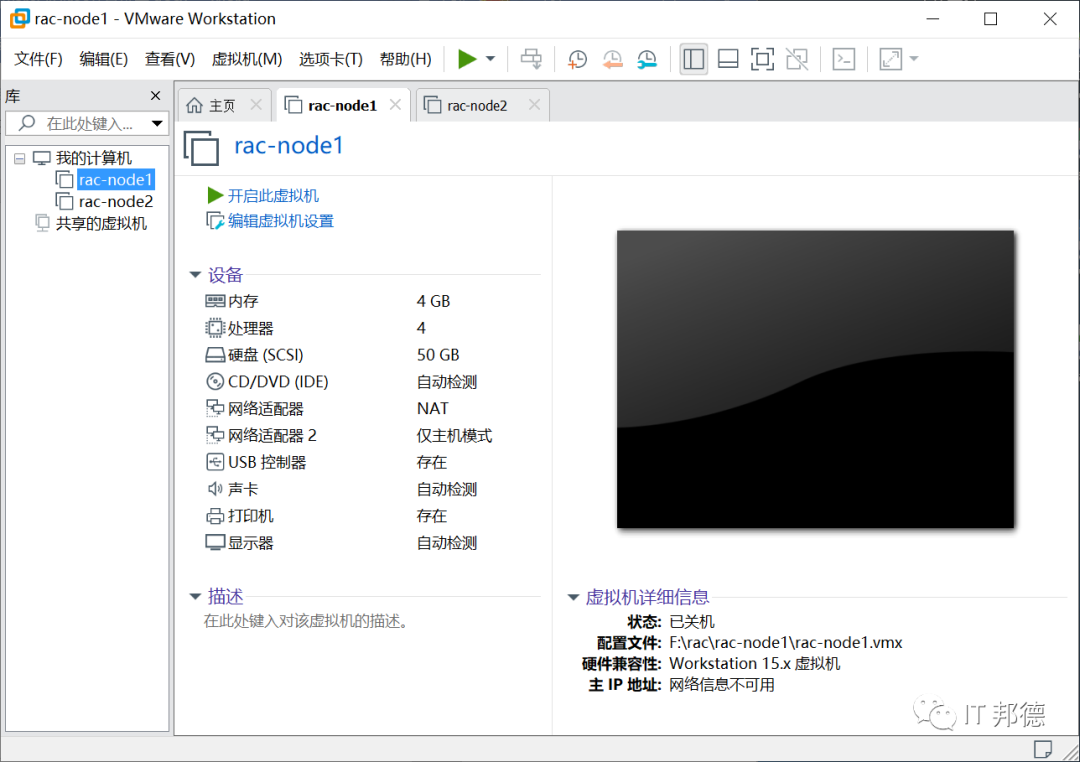 节点 1:rac-node1,添加两块网卡,一块 NAT 模式,一块仅主机模式,添加共享文件