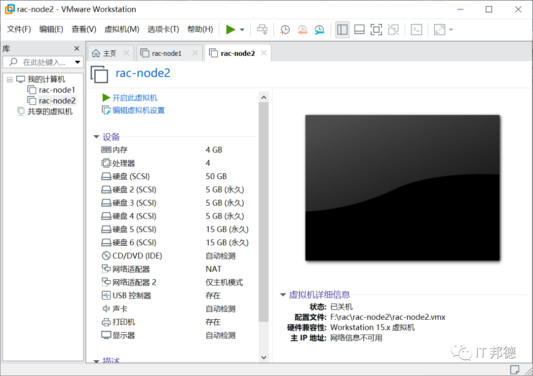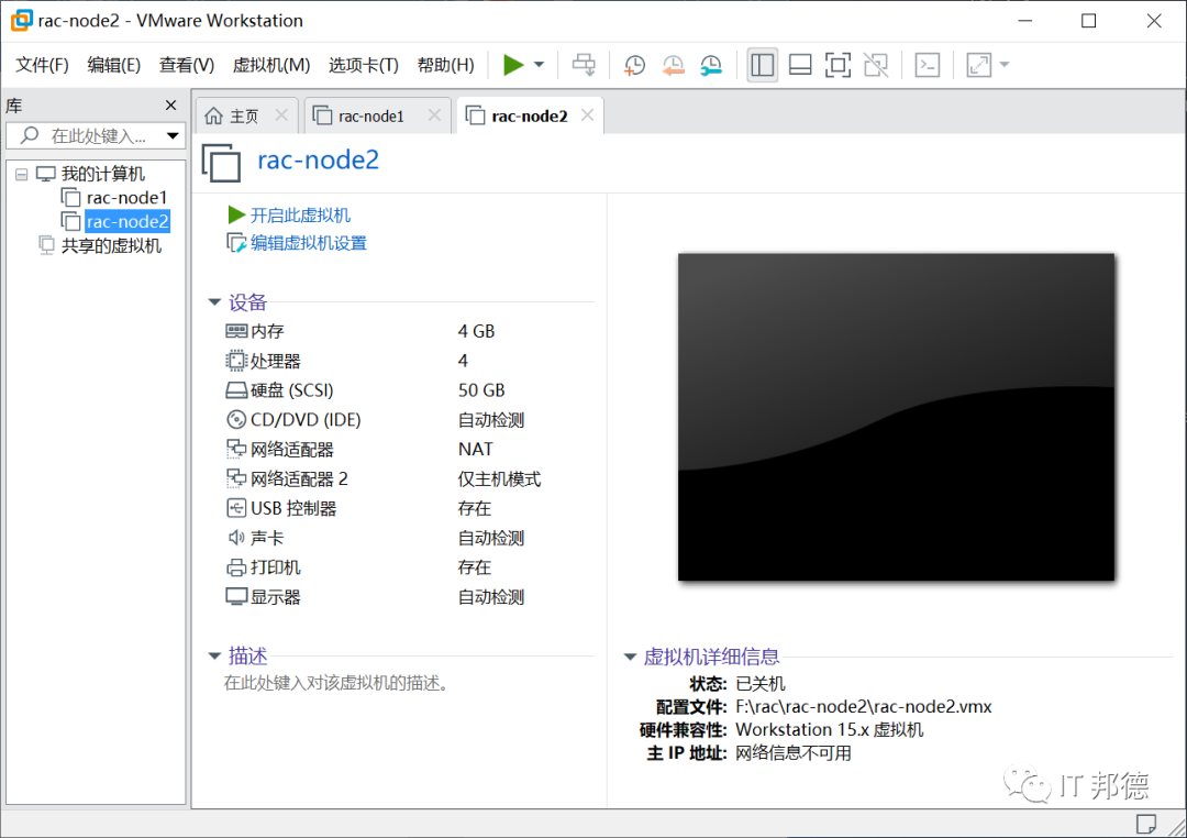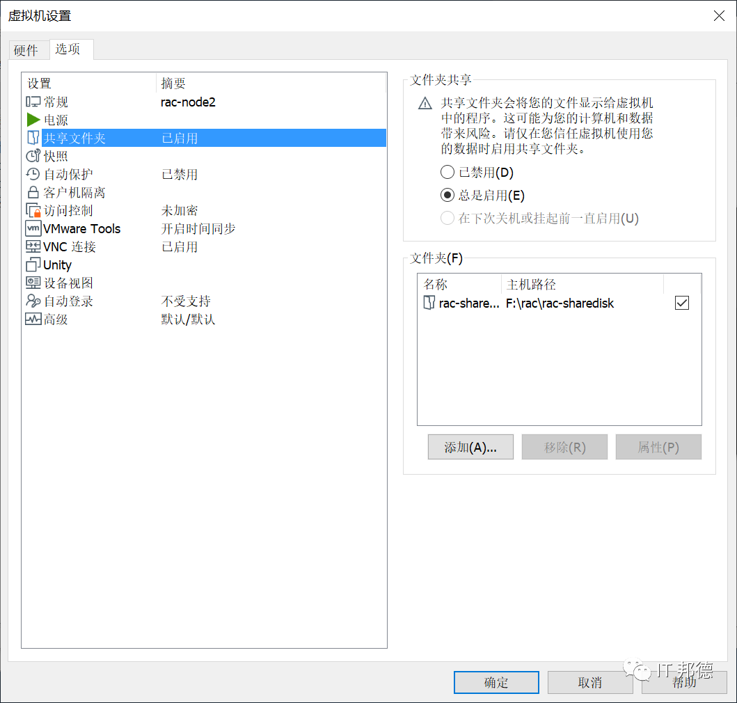 节点 2:rac-node2,添加两块网卡,一块 NAT 模式,一块仅主机模式,添加共享文件夹。