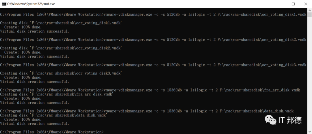 vmware-vdiskmanager.exe -c -s 15360Mb -a lsilogic -t 2 F:\rac\rac-sharedisk\data_disk.vmdk