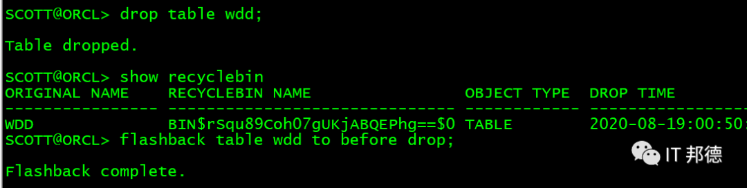 通过 show recyclebin 命令可以查看被删掉的表的详细信息,或者查询