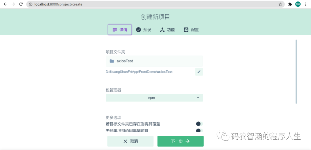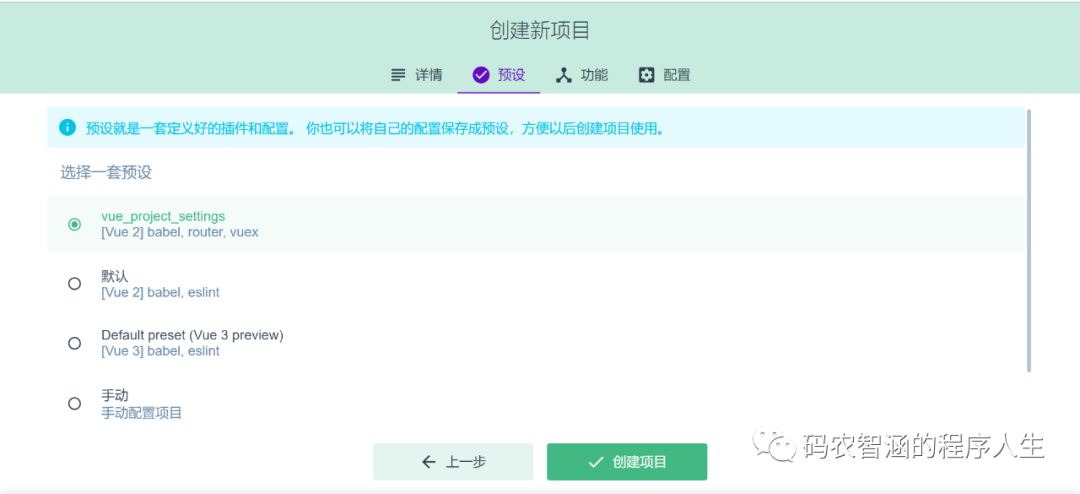 (2)选择之前对 vue2.0设置好的选项继续(仅个人开发风格偏好)。