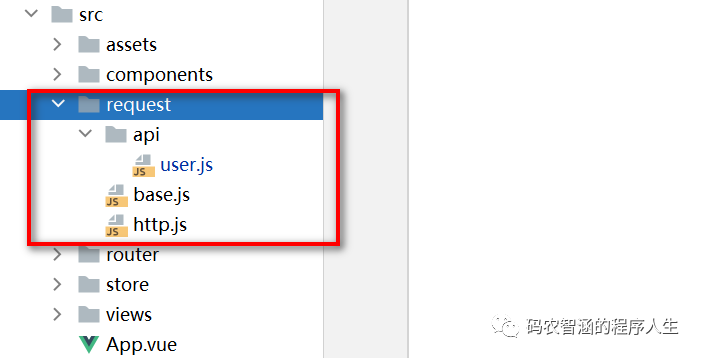 在新建项目中的 src 目录下新建一个 request 文件夹,然后在里面新建http.js,base.js,新建api文件夹存放 user.js .