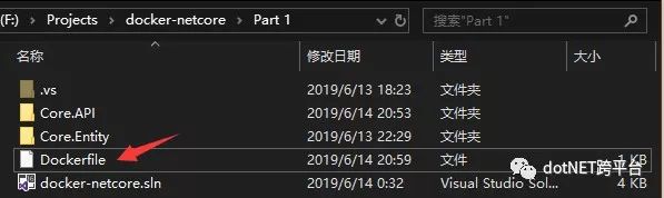 找到我们的解决方案文件夹,创建一个名为Dockerfile