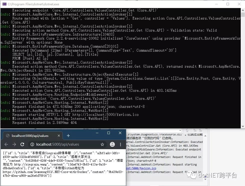不出意外等一段时间你应该会发现自己的 API 在容器里活泼地蹦达了起来,我们这次访问http://localhost:5000/api/values/5这个 Url,你应该能看到跟之前一样的结果。