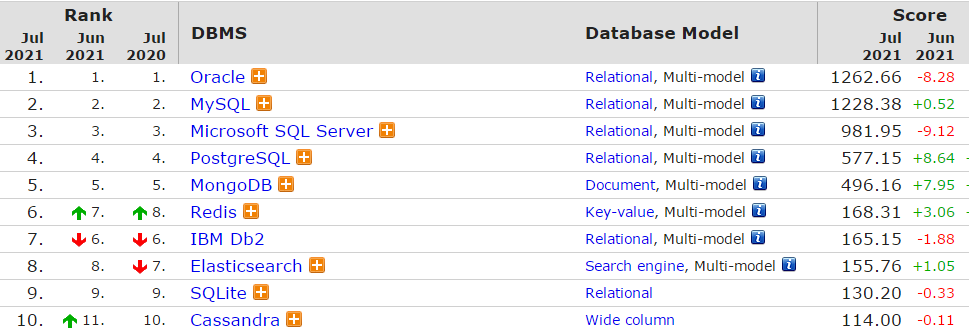 DB-Engines最近发布了 2021 年 7 月份的数据库排名。