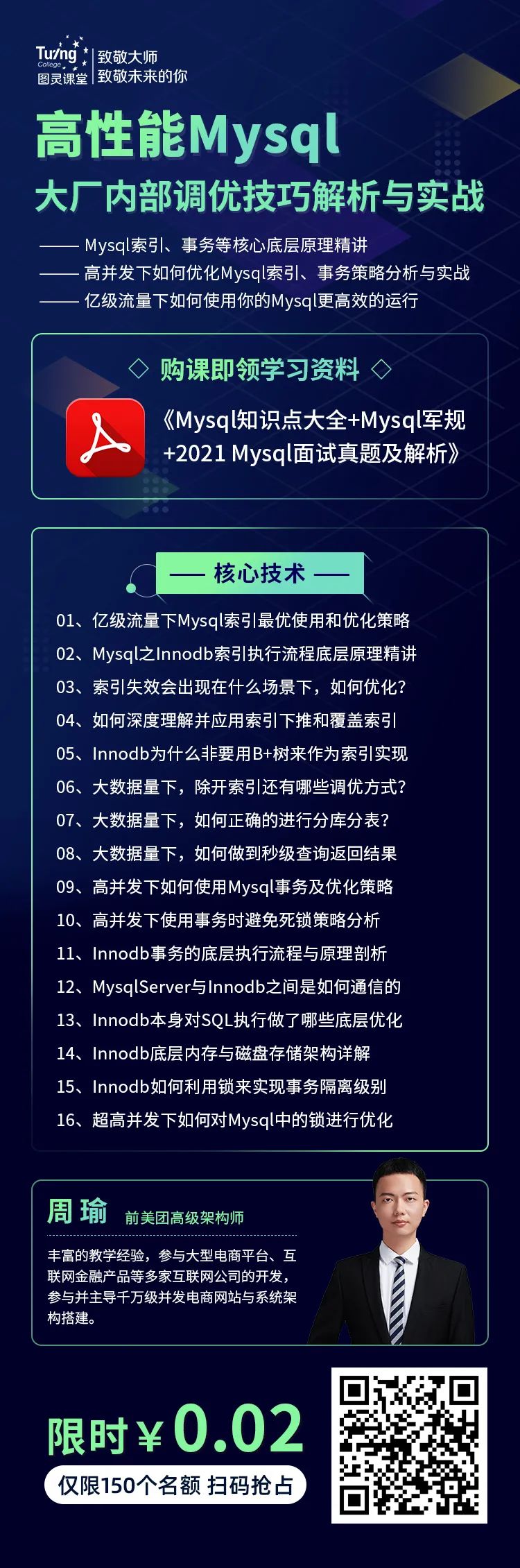 我也为我的粉丝争取到了150个优惠名额,限时优惠0.02元,还要到了一份三合一的硬核学习资料:《Mysql知识点大全+Mysql军规+2021 Mysql面试真题及解析》,扫码就能领!