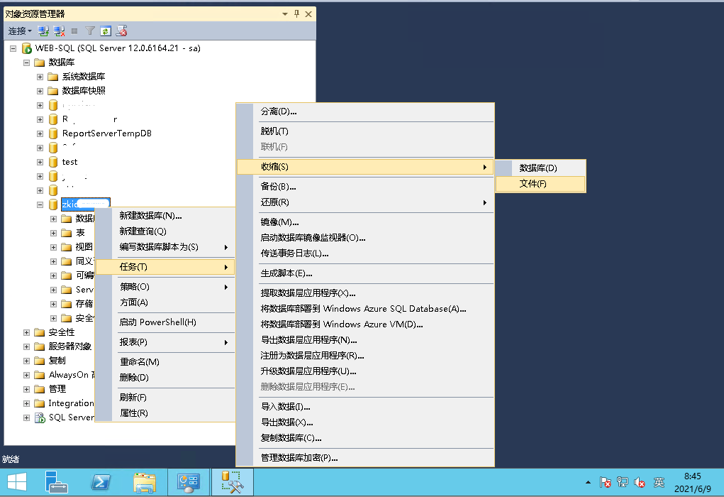 2.5、然后将在此数据库上右击,选择任务---收缩---文件。