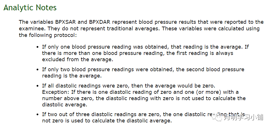 血压作为体测中的常见指标,在NHNAES也有测量。细心观察的朋友,应该会发现1999-2002中关于血压有一个比较特殊的算法(与普通的平均值不同,详见下图),变量名为BPXSAR, BPXDAR。