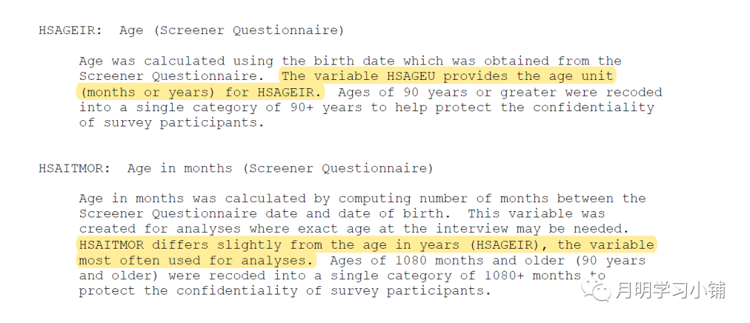 值得一提的是,NHANES官方公布的年龄变量有两种单位,分别是年和月。具体选取哪一种单位,NHANES Ⅲ的文件中有详细说明,我截图出来供大家参考。