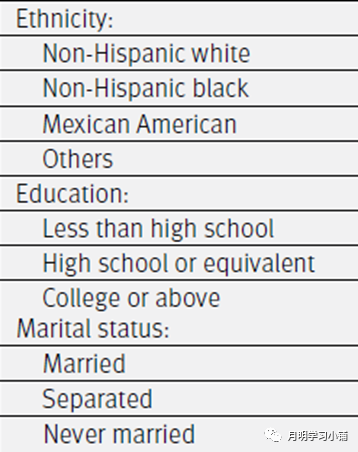 种族比较常见的分类是墨西哥裔、非西班牙裔白人、非西班牙裔黑人、其他。和NHANES公布出来的种族分类不同,大家赋值的时候对照修改一下即可。