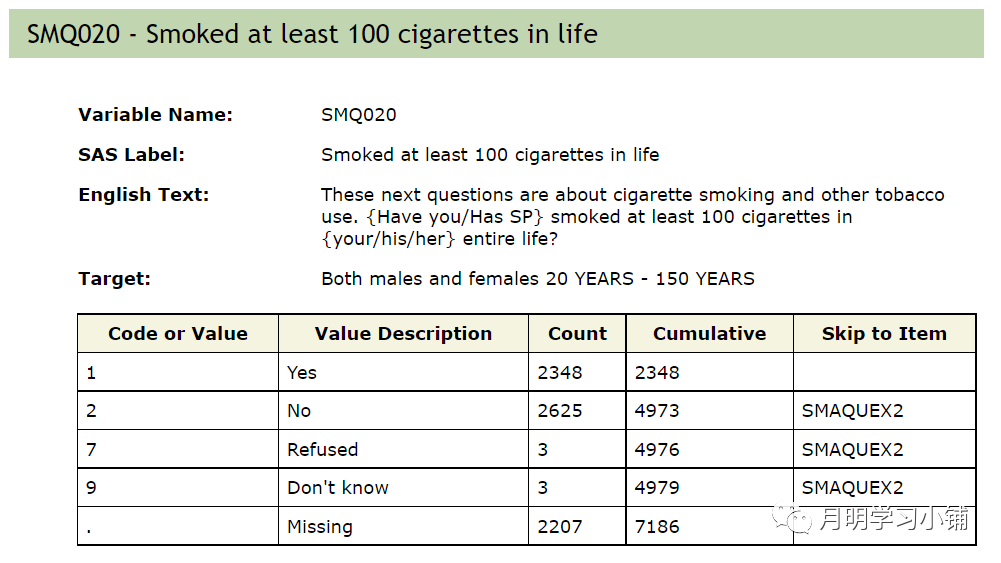 和我们常见的分类一致,在用NHANES发表文章中吸烟比较常见的分类也是从不吸烟、以前吸烟、现在吸烟。