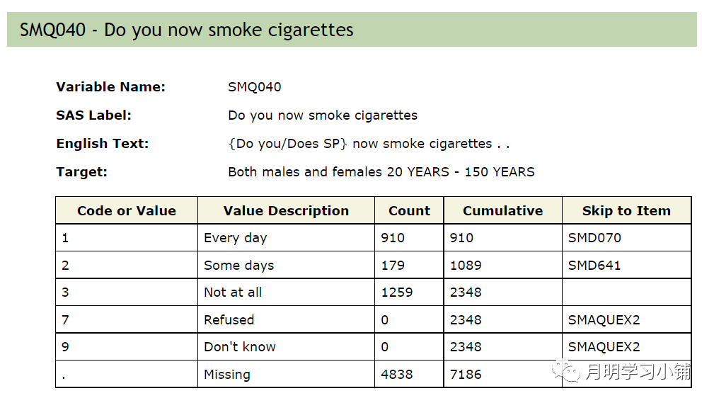 将NHANES公布的吸烟相关变量转换为上述分类时,需要考虑问卷设计时的逻辑跳转问题。举个例子,在询问受访者是否吸过烟时,如果受访者回答否,那么就不存在再问受试者每天吸多少烟的情况。