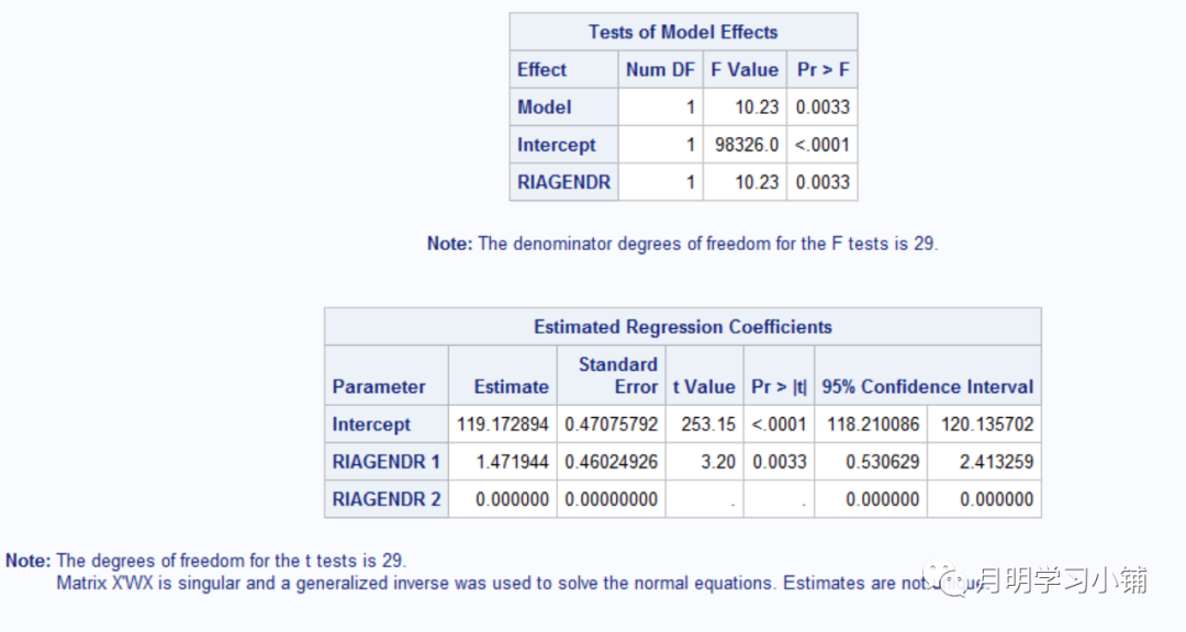 PROC SURVEYREG data=analysis_data nomcar;STRATA sdmvstra;CLUSTER sdmvpsu;CLASS riagendr;WEIGHT wtmec4yr;MODEL bpxsar = riagendr/solution clparm vadjust=none;/*nomcar表示非完全随机删失,与Taylor series variance estimation(Nhanes官网推荐,可用varmethod=taylor指定)配套使用;class语句表示在不同性别之间比较差异,与一般线性模型中一致;有class语句时,如果想得到estimate,SE,以及95% CI的话需要在model语句中加入solution clparm;vadjust=none表示不用自由度校正方差估计,SAS默认vadjust=df,在本程序中两个选项结果差距不大*/run;