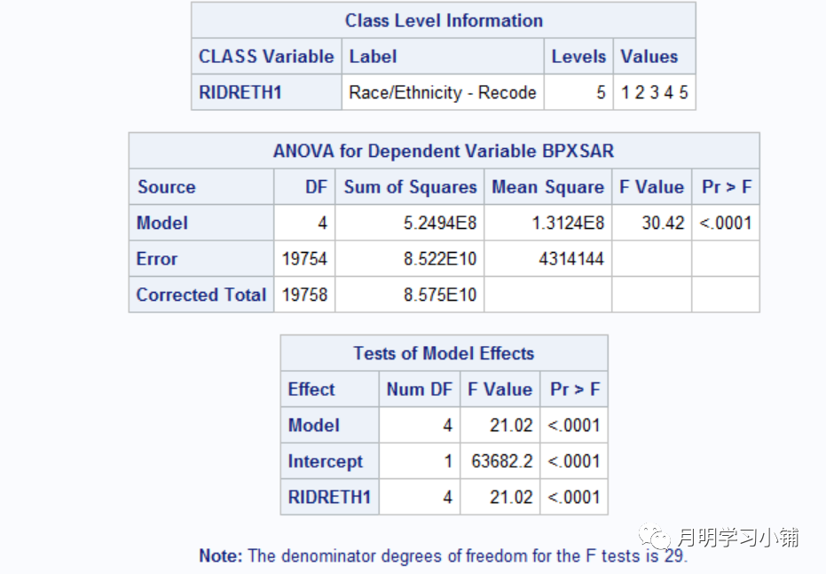 PROC SURVEYREG data=analysis_data nomcar ;STRATA sdmvstra;CLUSTER sdmvpsu;CLASS ridreth1;WEIGHT wtmec4yr;MODEL bpxsar = ridreth1/solution clparm vadjust=none anova;/*MODEL语句中加入anova选项,CLASS语句中变量由性别换为种族*/run;