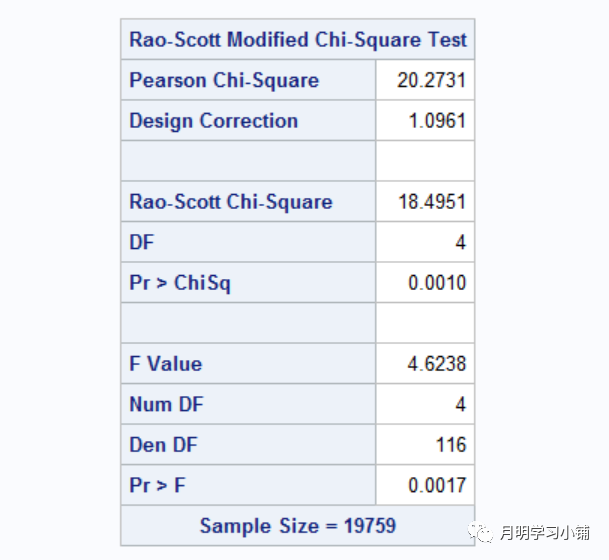 按照官网推荐采用Rao-Scott Chi-Square的结果,P值为0.0010。