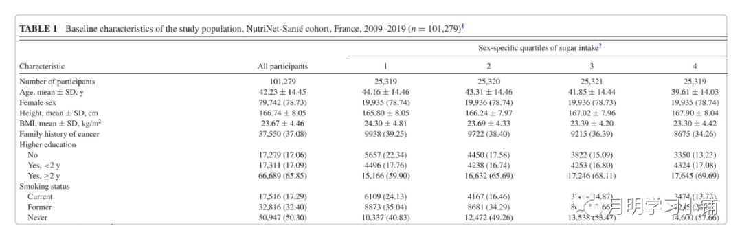 以基于法国NutriNet-Santé队列研究发表文章为例,摘取其中的Table 1及方法结果描述。