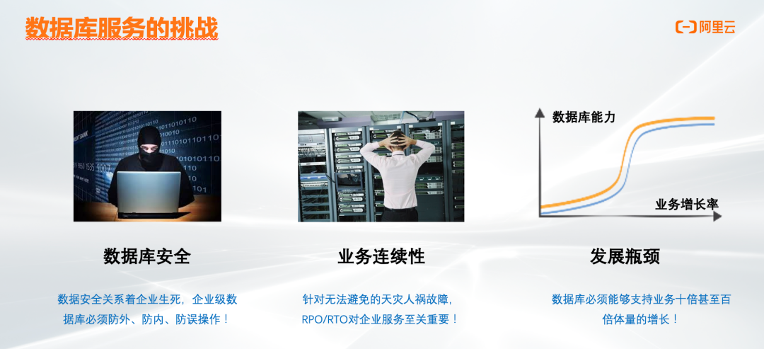 首先是数据库安全;其次是如何保障业务连续稳定运行,数据不丢失;最后是随着我们业务发展越来越迅速,业务量是以前的十倍甚至百倍的时候,如何支持业务发展,必须寻找适当的解决方案来解决这个问题。