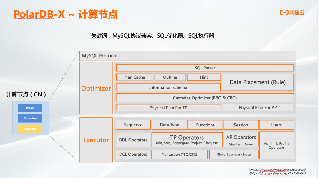 计算节点(CN)兼容MySQL协议,上面有SQL优化器和执行器,可以看到支持RBO(Rule-Based Optimization)和CBO(Cost-Based Optimization)的优化,执行层面还支持AP这种数据操作。