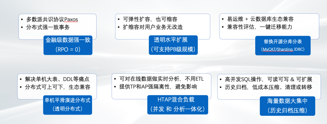 首先是高可用性,可以做到RPO为0,数据不丢。其次具备高兼容性,能够和MySQL进行兼容,而且PolarDB-X主流国产操作系统和芯片互认证。然后还有高扩展能力,单实例可以突破256个节点。除此之外还支持HTAP的访问模式和极致的弹性能力。
