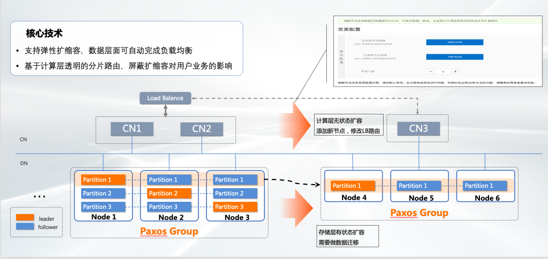 另一个典型的业务场景是透明水平扩展,对于CN这一层是无状态的,添加新节点,只需要修改Load Balance的路由即可。