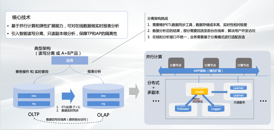 对于HTAP这种混合负载,以前的方式都是通过ETL,是把业务数据从业务数据库里面通过数据抽取ETL的模式,把它抽取到AP类的数据库里面。