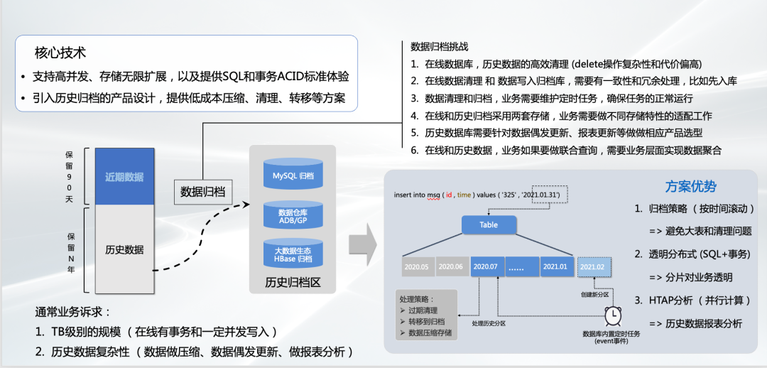 还有一个就是刚才提到海量数据大集中,尤其像比较大的客户企业应用。它做全国大集中的时候,分布式数据库就非常适合这种场景;还有很多历史数据是要保留不能删除的,可以放到历史归档区进行存储,不影响热数据访问。