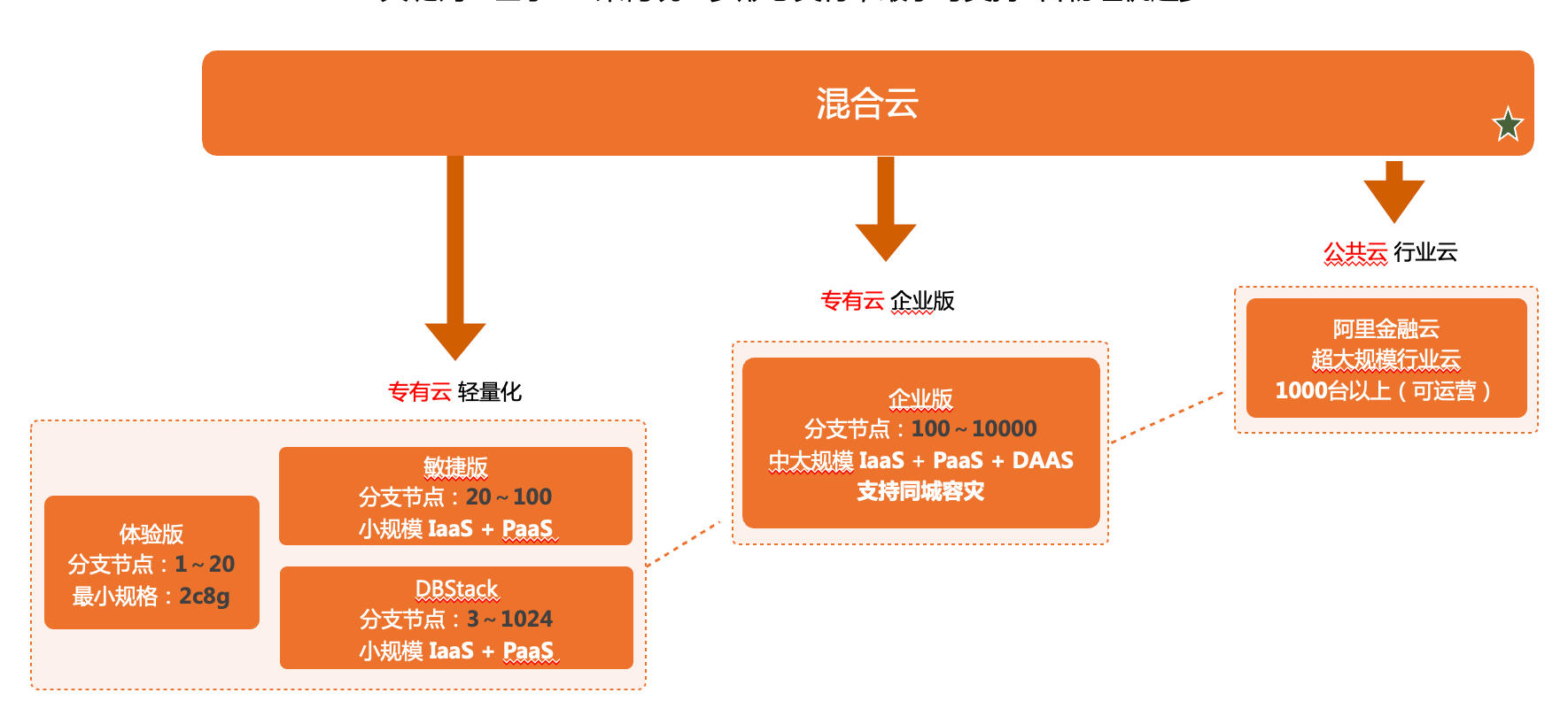 如果想用公有云的话,在公有云页面上可以直接进行购买。有些企业级的客户希望购买阿里云的云平台,数据库服务可以基于飞天平台,对应的我们有企业版的输出,这个规模相对会比较大。除此之外我们也有轻量化的输出,如敏捷版和即将推出的DBStack,最后还有一个支持做POC测试的体验版。