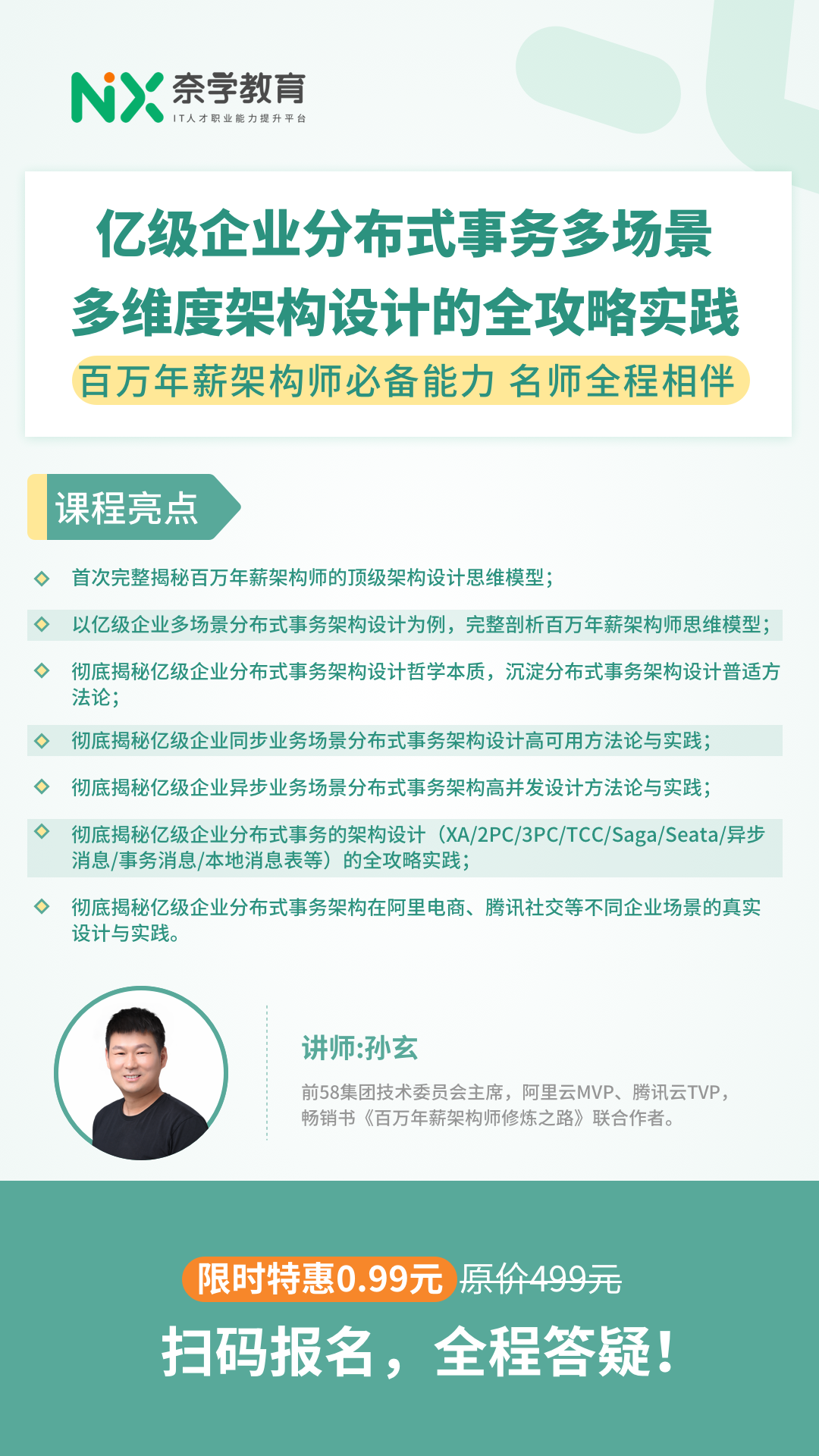 具体到应用落地,如何在数据库及服务层面进行部署?如何评估出业务对事务的优先级,将技术与业务结合,需要坚实的理论基础和扎实的实践经验。特别介绍一位在这方面有10余年经验的行业专家——玄姐(阿里云MVP/腾讯云TVP/前58技术委员会主席),他联合快狗打车CTO沈剑,把对分布式事务的深入思考结合「代码」,不断打磨、凝练,熬出了一套最新的,包含 3 大篇章 18个必知必会要点的在线专栏课(原价499,年中特惠仅0.99)!7月26日 - 28日,每晚20:00-22:00