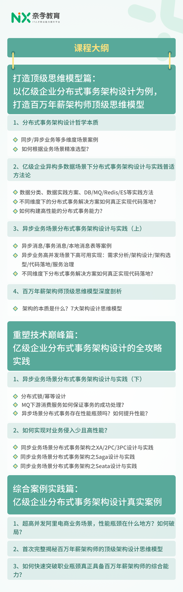 原价 ¥499,现 ¥0.99 !56天内最低价!勤学福利:特别精选了16本知乎、豆瓣高赞热评好书,都是程序员经典必读书目,覆盖数据库、算法、Java、微服务等必备技术栈,无套路,购课后直接联系老师领取即可~在阿里电商、腾讯社交这类亿级分布式事务架构中,点对点的技术已不再是架构师需要聚焦的核心。玄姐也曾谈到这一点:“百万年薪架构师的核心竞争力,其实是对架构设计的升维认知以及所具备的顶级思维模型。”玄姐在多年首席架构师的经验中发现:百万年薪架构师的顶级思维模型之一,是根据(业务)场景Balance的架构设计思维模型。BAT超一线大厂架构设计固然优秀,但照搬拷贝就变得很可笑。作为顶级架构师你需要根据所处公司的业务特点、请求并发、数据规模等场景给出灵活优雅的架构设计解决方案,满足公司未来6个月到2年的业务发展需求。具备这些顶级架构设计思维模型,也就具备了架构设计的哲学本质,从而形成了以不变应万变的架构设计能力;具备这些顶级架构设计思维模型,也就具备了架构设计的“道”,也就彻底明白百花齐放的架构模式(单体架构、分布式事务架构、SOA、微服务架构、服务网格、云原生架构、Serverless架构、中台化架构等)只为满足各类企业不同场景的业务需求,从而能够真正做到架构设计的终极目标降本增效。在新技术日新月异变化的今天才不会迷失方向,才不会担心惧怕所谓35岁年龄问题。在架构师领域,这门课的讲师前58技术委员会主席玄姐的技术实力和架构设计思维模型可谓有口皆碑,这次倾力打造分布式事务架构课程,目的就是为了让大家掌握分布式事务架构这一难啃知识点,同时掌握百万年薪架构师的顶级思维模型,剑指年薪百万!金牌教研团,平均从业年限10年以上,具备大厂实战经验,对技术深度钻研,对教学精益求精,历时半年精打细磨。行业大咖级主讲,前58集团技术委员会主席,腾讯云TVP,阿里云MVP,具备多年架构设计及大型项目经验。备教测练评学习闭环,帮助学员循序渐进提升技术硬实力,老师全程辅导,稳步提升职场软实力。✔ 掌握百万年薪架构师的顶级架构设计思维模型,具备以不变应万变的架构设计能力;✔ 掌握亿级企业分布式事务架构设计哲学本质,沉淀分布式事务架构设计方法论,从而能够给出优雅架构设计解决方案;✔ 掌握亿级企业同步业务场景分布式事务架构设计的高可用设计方法论与实践,能够确保在生产环境中稳定运行;✔ 掌握亿级企业异步业务场景分布式事务架构设计的高并发设计方法论与实践,再也不惧怕海量高并发;✔ 掌握亿级企业分布式事务架构设计(XA/2PC/3PC/TCC/SAGAS/Seata/异步消息/事务消息/本地消息表等)的全攻略实践,从而轻松应对企业各种各样的复杂应用场景;✔ 掌握亿级企业分布式架构在阿里电商、腾讯社交等不同企业场景的真实设计与实践,能够做到举一反三。✔ 技术负责人/技术经理/技术总监/技术VP/CTO那么百万年薪架构师亿级分布式事务架构设计与实践这门实践精品课,正是为你量身定做的!