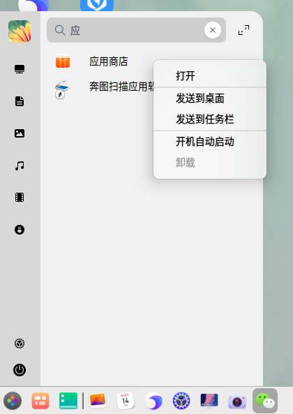 在上图界面点击应用商店即可打开。若想下次使用方便,可点击鼠标右键出现下图小菜单,选择发送到桌面或发送到任务栏。(注:电脑屏幕最下方即为任务栏)