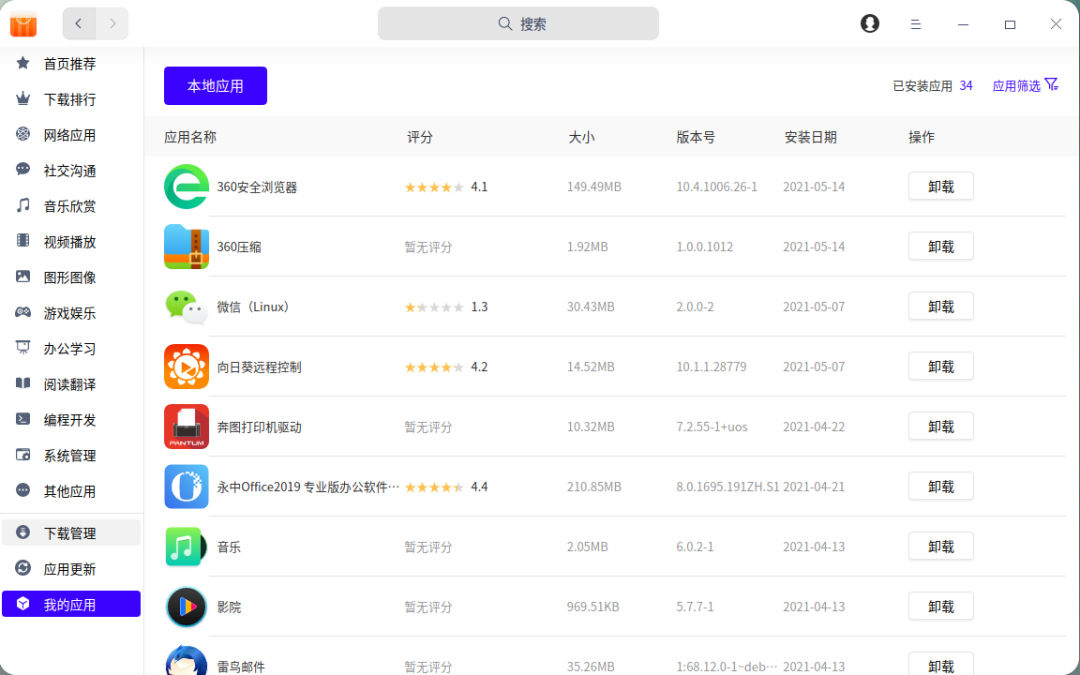 在我的应用界面大家是不是看到了第二个卸载方法呢?没错就是右侧的卸载按钮,所以不想要的软件也可以在这里卸载。