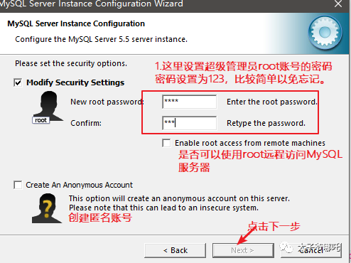 (新建一个匿名用户,匿名用户可以连接数据库,不能操作数据,包括查询),一般就不用勾了,设置完毕,这里密码设置为123,上下得一致,才可以按Next