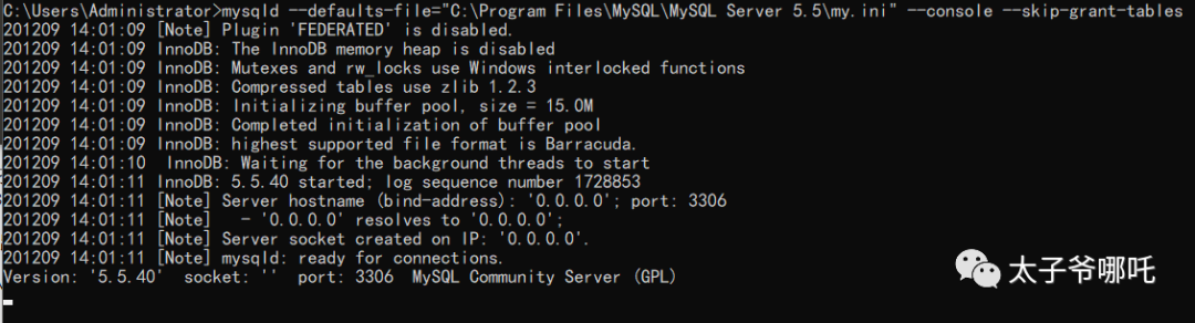 mysqld --defaults-file="C:\Program Files\MySQL\MySQL Server 5.5\my.ini" --console --skip-grant-tables解释下:这个命令可以通过跳过权限安全检查,开启