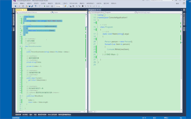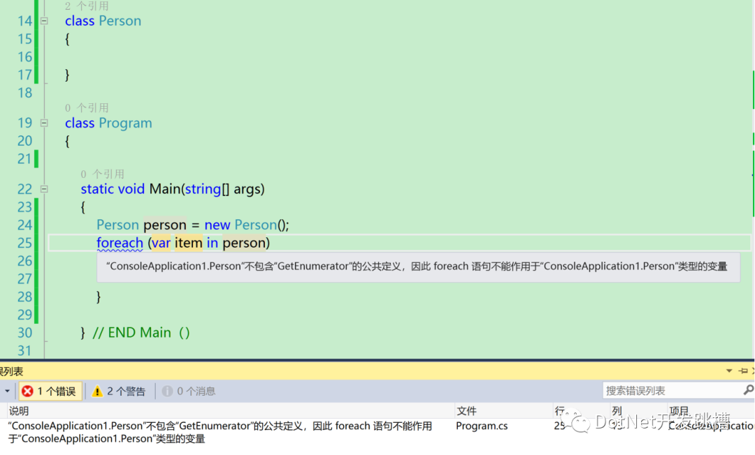 运行VS后编译器提示了错误,根据错误描述可以推断出foreach需要调用Person类型中的”GetEnumerator”方法。