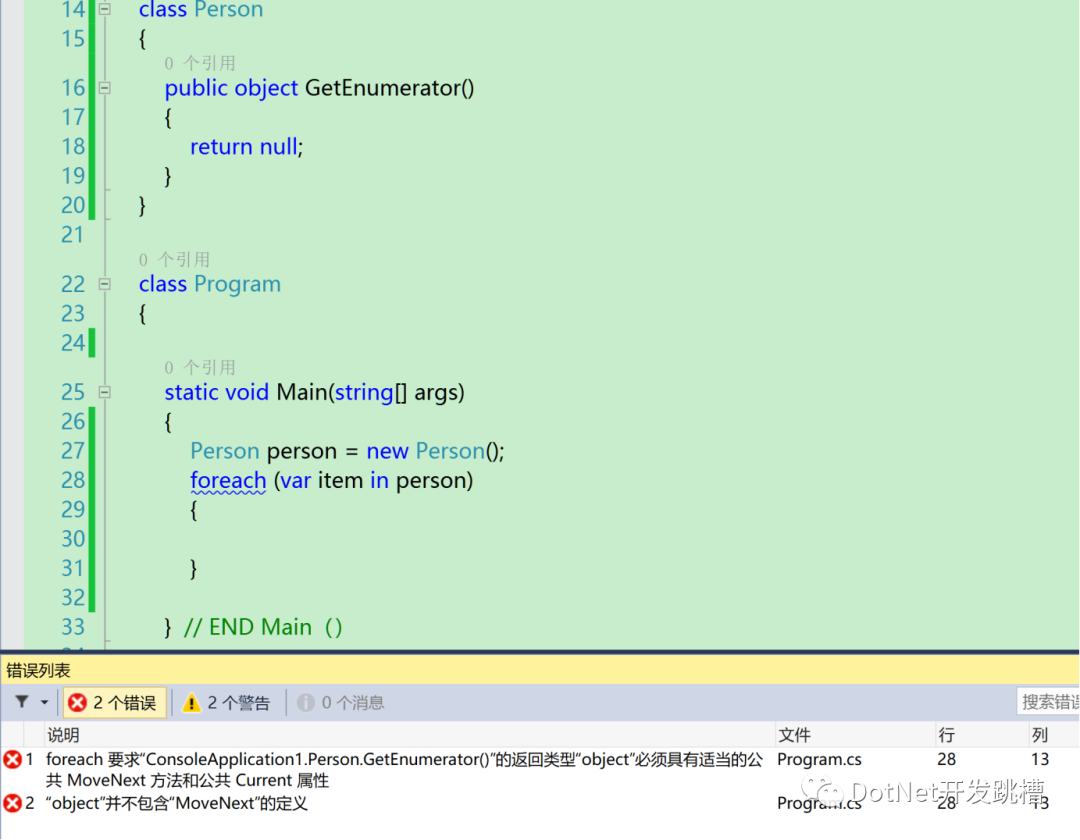 下一步我们根据编译器的要求在Person类型中添加”GetEnumerator”方法,添加该方法后又出现如下的错误提示: