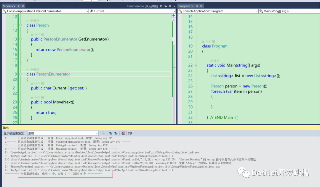 到目前为止我们已经将一个不具备foreach条件的自定义类型,通过自编码实现了foreach的基本要求。下面我们通过代码运行看看执行结果: