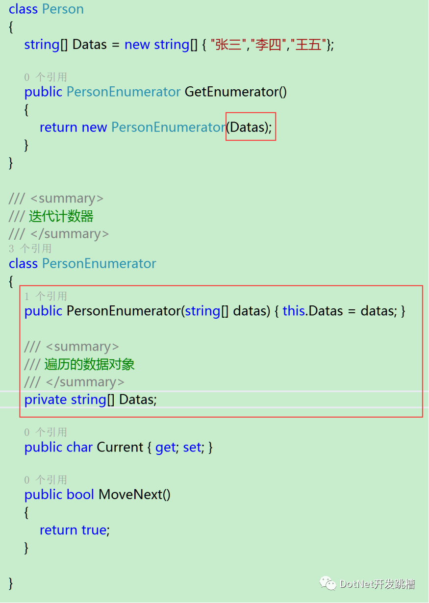 添加foreach“遍历的数据对象”后又有问题来了,foreach如何访问到这个数据呢。我们可以将数据作为“迭代计数器对象”构造函数的参数在GetEnumerator方法中传递过去,然后“迭代计数器对象”中提供一个字段进行存储。
