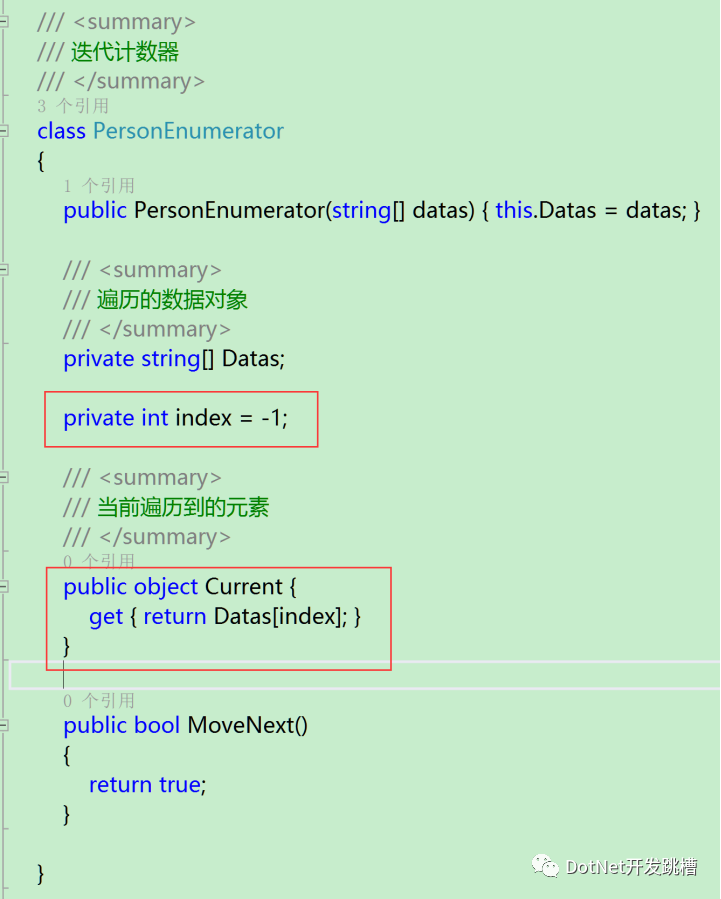目前我们遍历的“对象”是一个string数组,所以要读取这个数组里的元素,我们需要一个下标索引来读取遍历到的当前元素,并作为Current属性值。下面我们将设置一个int类型值为-1的字段作为“读取下标”,然后在Current属性的get方法中通过下标索引器读取“当前遍历到的数据对象”。