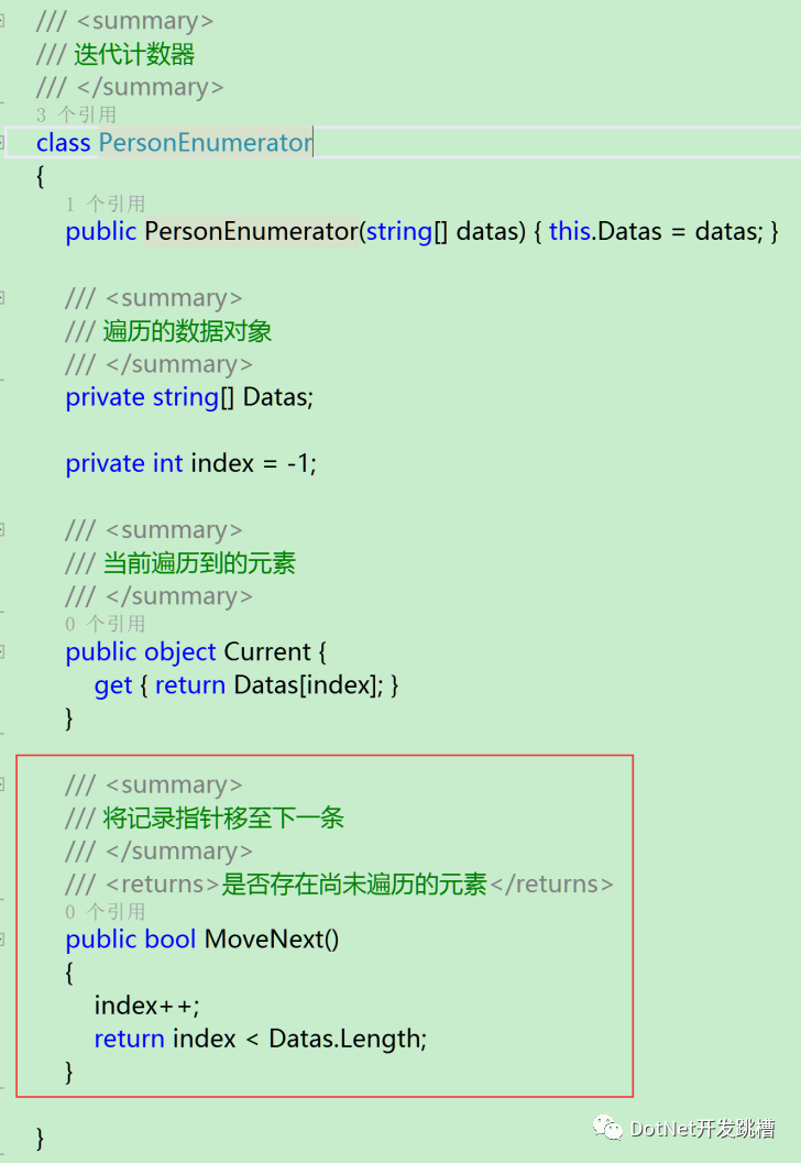 因为我们是通过下标去访问元素的,所以需要对下标进行递增进行变化,从而不断指向下一个元素从而到达累计。MoveNext方法是一个布尔的返回值类型,其主要目的是告知foreach当前遍历的数据对象是否还存在没有遍历到的元素,如果存在元素则不断递增下标索引并反会true,反之返回false并结束遍历,MoveNext方法的返回值相当于foreach遍历的前提条件。