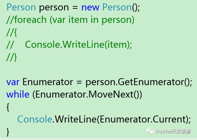 如果MoveNext()方法返回true,就使用IEnumerator接口的Current属性获取对象的一个引用,用于foreach循环。