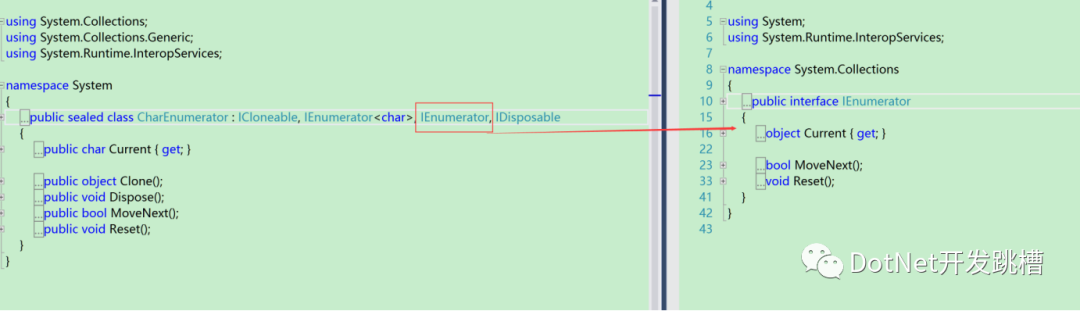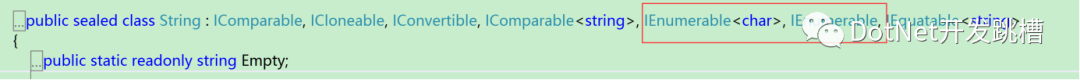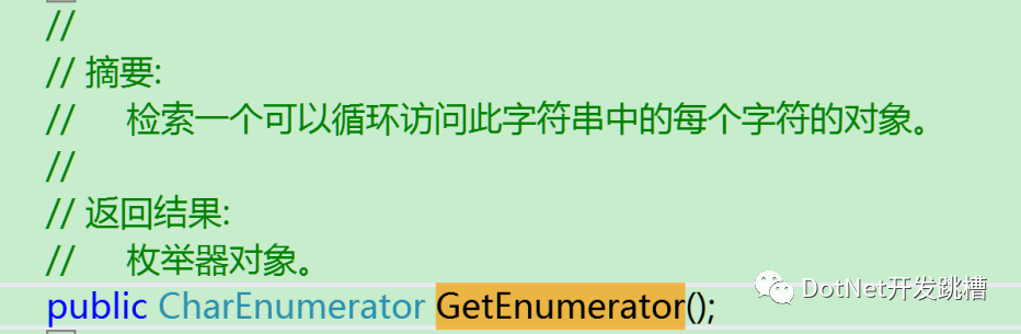 此时我们可以去已经支持foreach的类型中查找GetEnumerator方法返回值类型,并对该类型的实现进行仿写并用于我们自定义类型当中。string类型作为常用类型并支持foreach遍历,下面我们查看该string的GetEnumerator方法返回值类型进行仿写。